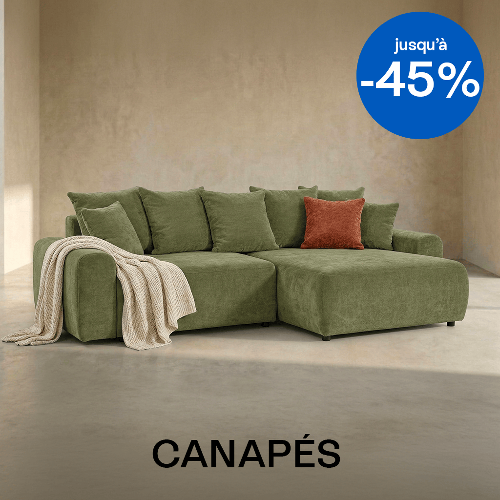 Canapé d'angle convertible 4 places - Monceau• Angle réversible permettant d’installer le canapé à droite ou à gauche selon l’agencement de votre pièce.• Couleur : Vert olive• Revêtement : Tissu chenille 310 g/m² certifié Oeko-Tex®, testé pour limiter la présence de substances nocives et offrir un contact plus sûr au quotidien• Structure : Bois certifié...