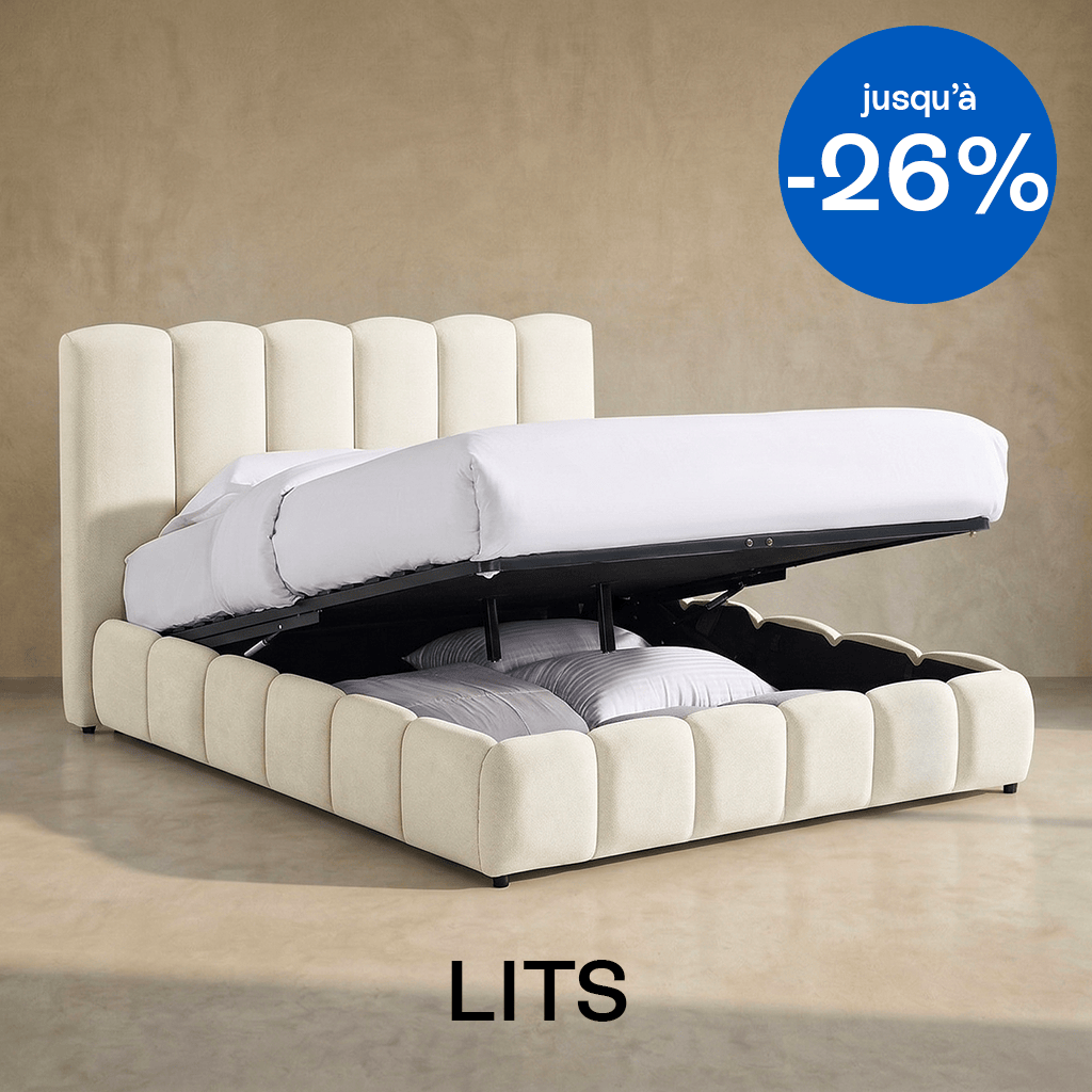 Lit coffre en tissu chenille - Nils• Structure : Contreplaqué• Revêtement : Tissu chenille 310 g/m² certifié Oeko-Tex®• Couleur : Beige• Garnissage : Mousse• Sommier 28 lattes en bois de Peuplier (ép. 10 mm). Espacement entre les lattes : 70 mm. Système d'ouverture à vérins hydrauliques.• Dimensions du couchage : 140 x 190 cm• Dimensions totales : 206 x...